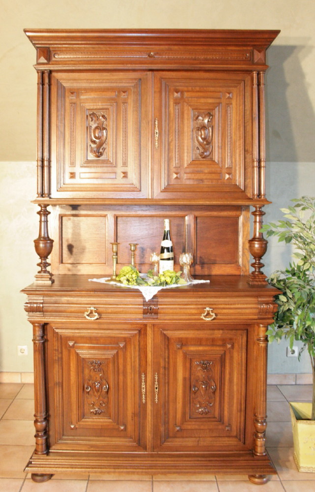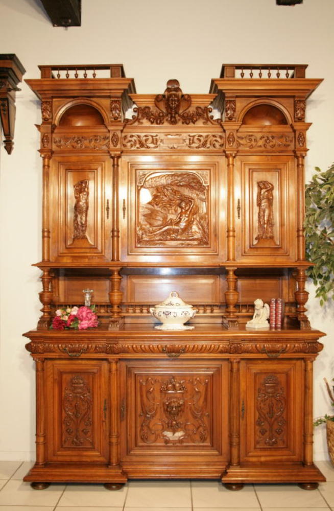 Elegante Kredenz Büffet in Nussbaum um 1880 Elegante Kredenz Büffet in Nussbaum um 1880, reich geschnitzt. Breite 1,50 m Tiefe 57 cm Höhe 2,47 m 1300.00 € |