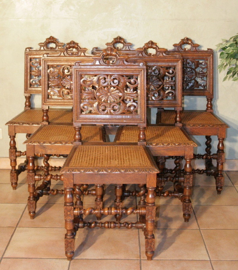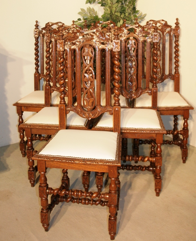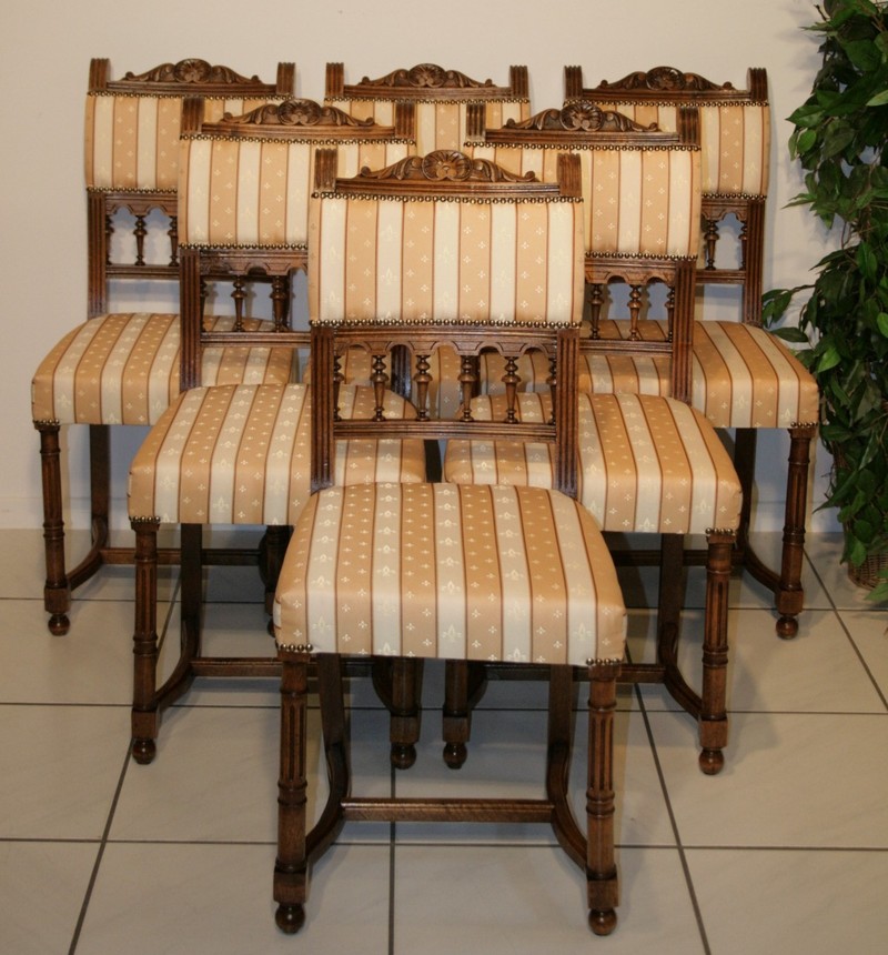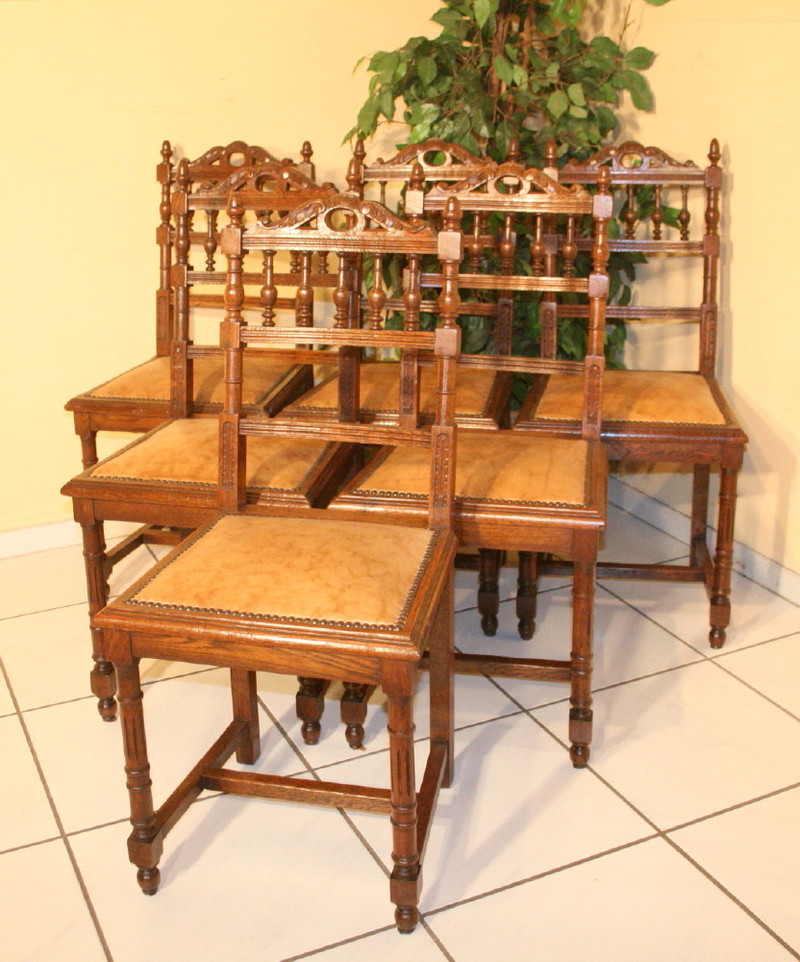 6 Wunderschöne Stühle in Eiche um 1880 6 Wunderschöne Stühle in Eiche um 1880. Breite 43 cm Tiefe 40 cm Höhe 93 cm Sitzhöhe 47 cm Gerne mailen wir Ihnen Detailbilder zu 0.00 € |