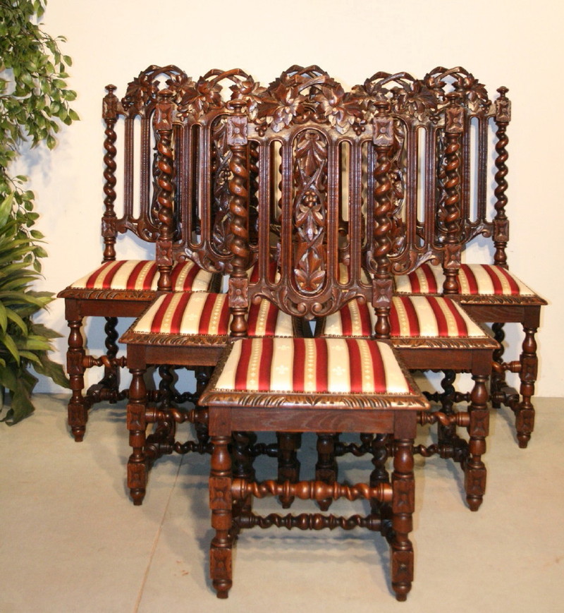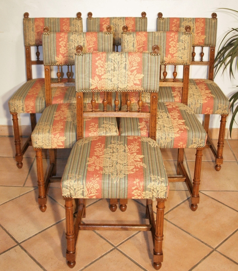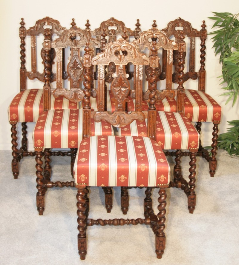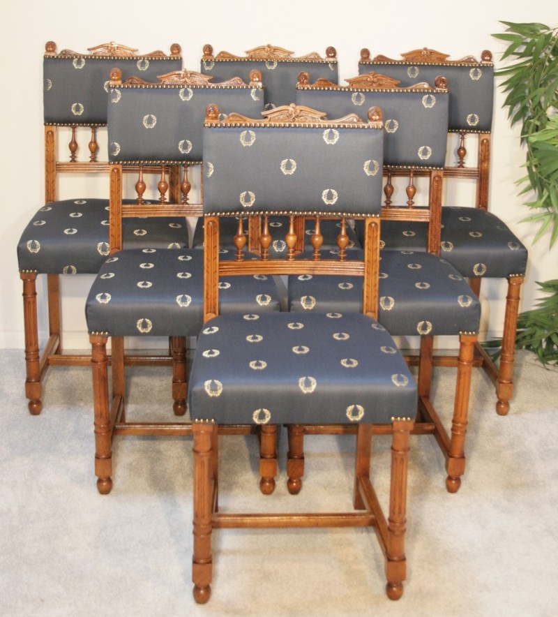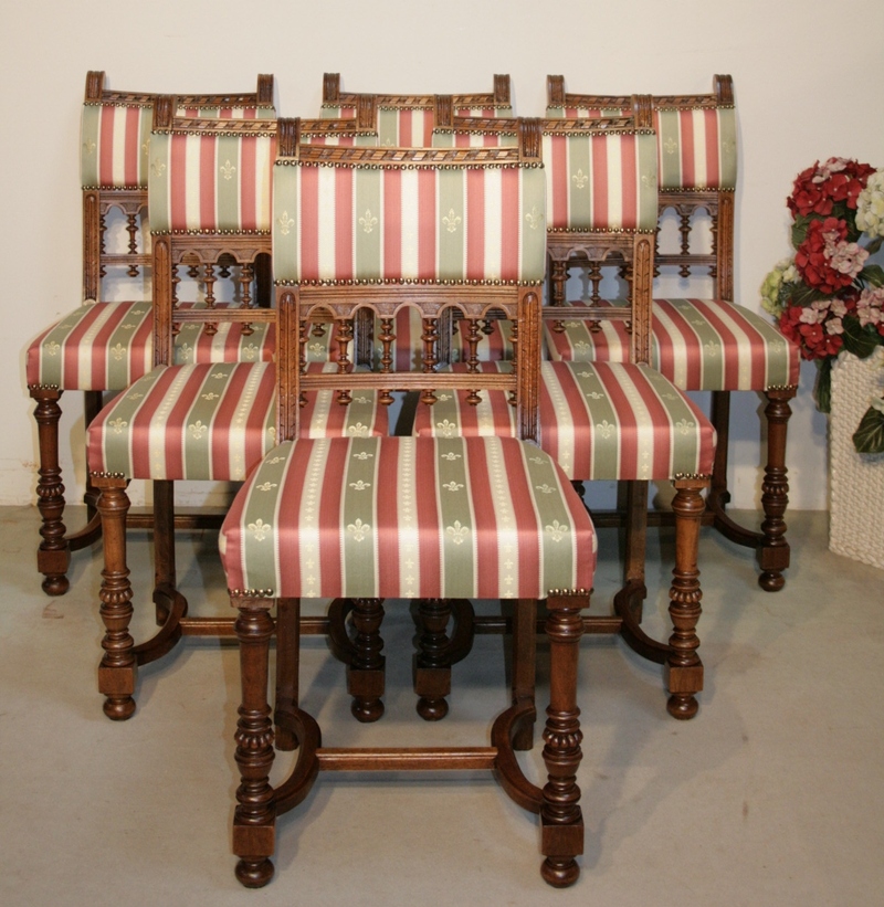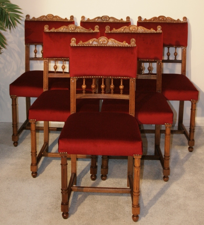 6 Wunderschöne Stühle mit Säulchen & Krone auf die Lehne 6 Wunderschöne Stühle in Nussbaum um 1880, komplett neu gepolstert Breite 46 cm Tiefe 41 cm Sitzhöhe 47 cm Höhe 95 cm 0.00 € |
