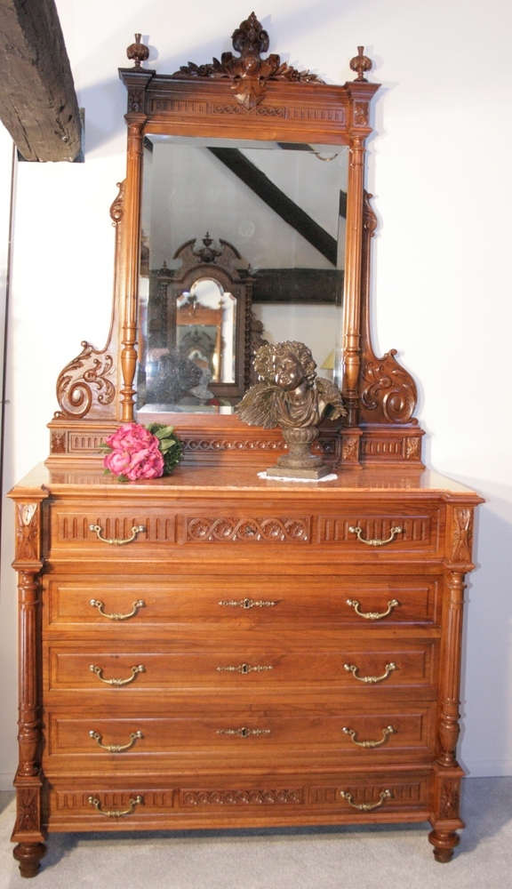 Wunderschöne Kommode in edlem Nussbaum um 1880 Wunderschöne Kommode mit Spiegelaufsatz in edlem Nussbaum um 1880 Breite 1,20 m Tiefe 55 cm Höhe 2,26 m 0.00 € |