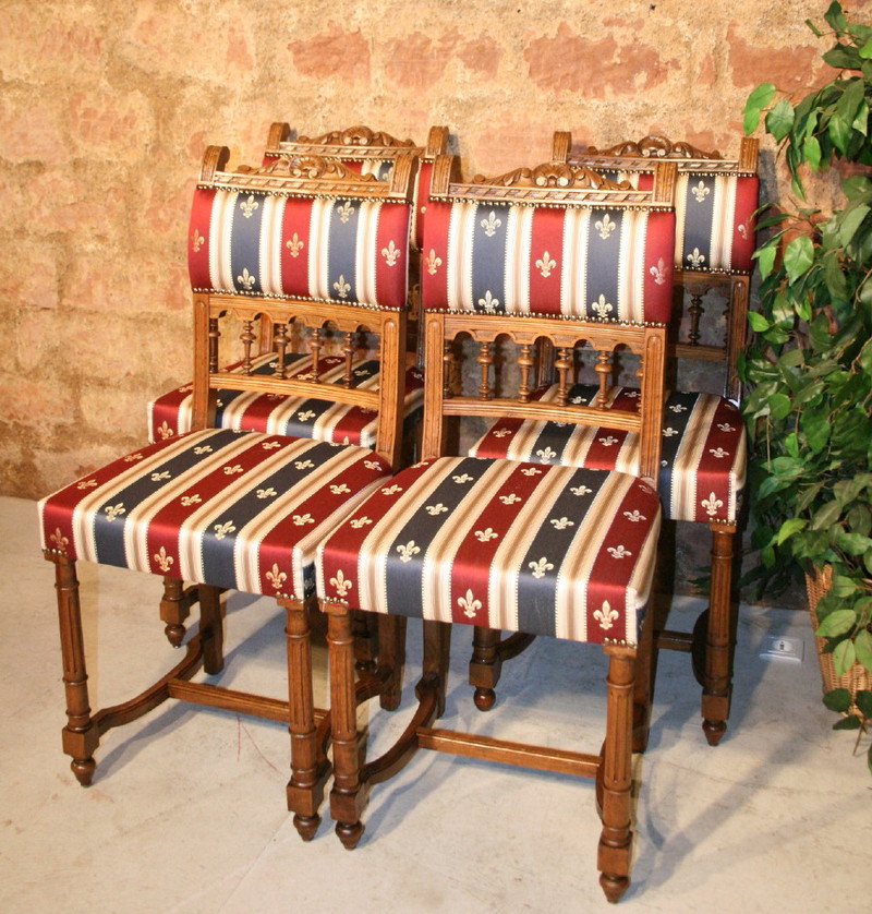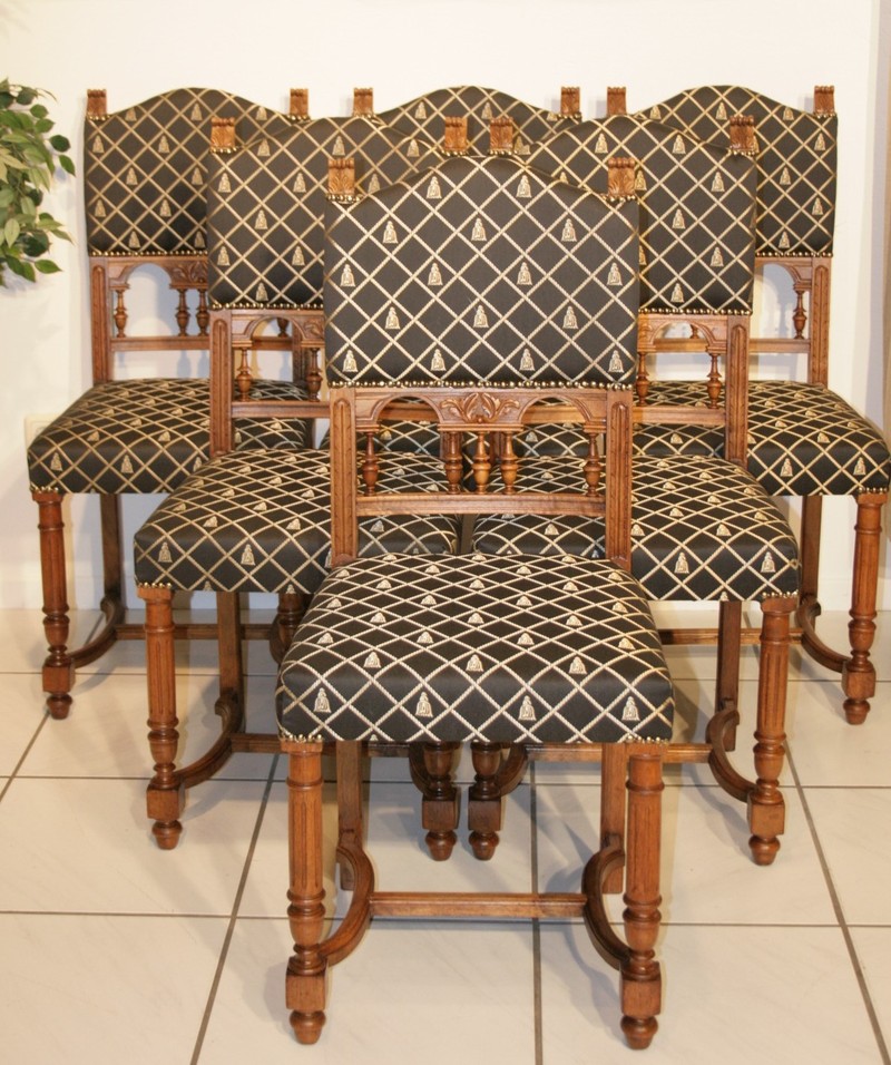 6 Wunderschöne Stühle in Nussbaum um 1880 6 Wunderschöne Stühle in Nussbaum um 1880, komplett neu gepolstert. Breite 44cm Tiefe 42 cm Höhe 1,00 m Sitzhöhe 49 cm 0.00 € |