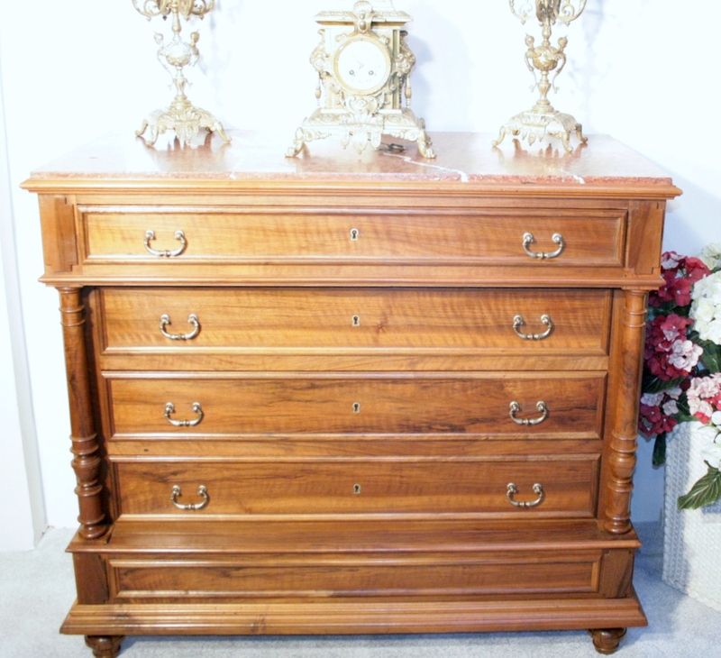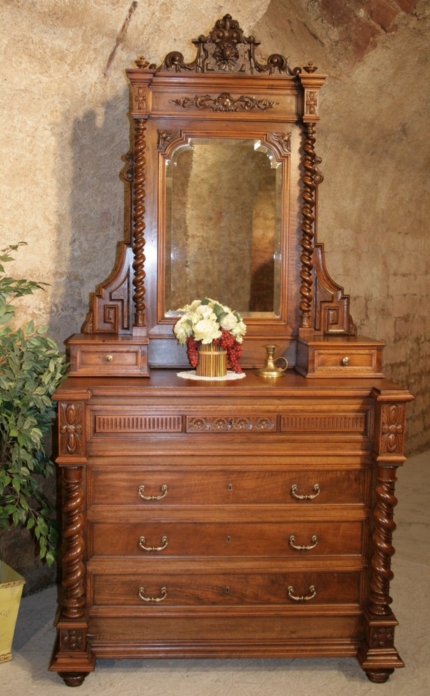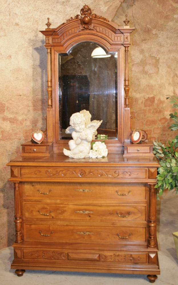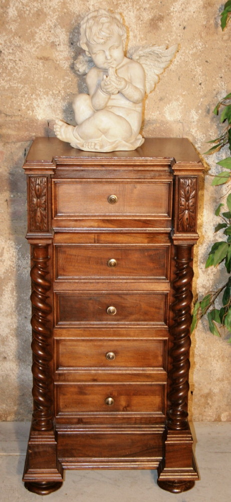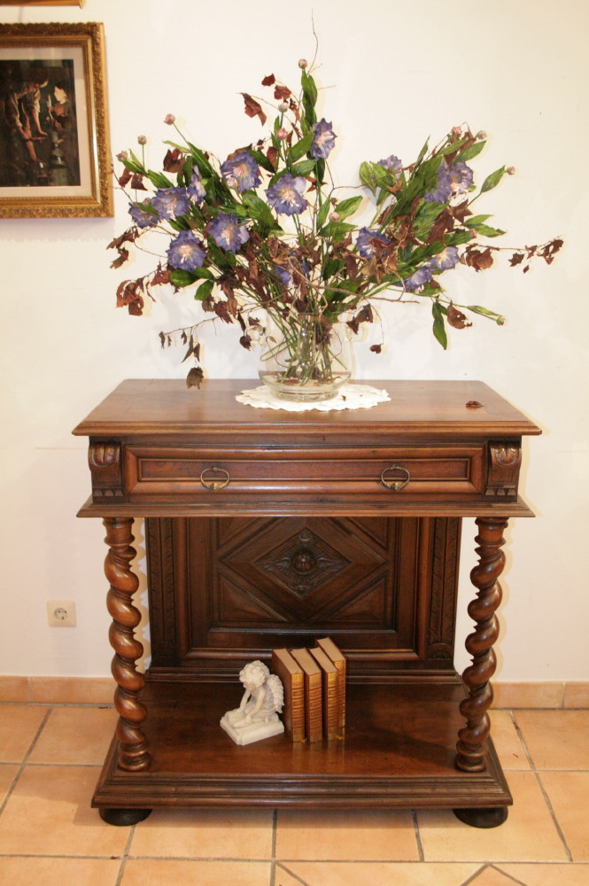 Elegantes Beistellmöbel in massiven Nussbaum um 1870 Elegantes Beistellmöbel, Teil eines Schlafzimmer um 1870 in massiven Nussbaum, reich geschnitzt, mit gedrehte Säulen, Top Zustand. Das Schlafzimmer besteht aus einem Kleiderschrank, eine Kommode, einem Bett und 1 Beistellmöbel. Breite 44 cm Tiefe 40 cm Höhe 98 cm 0.00 € |