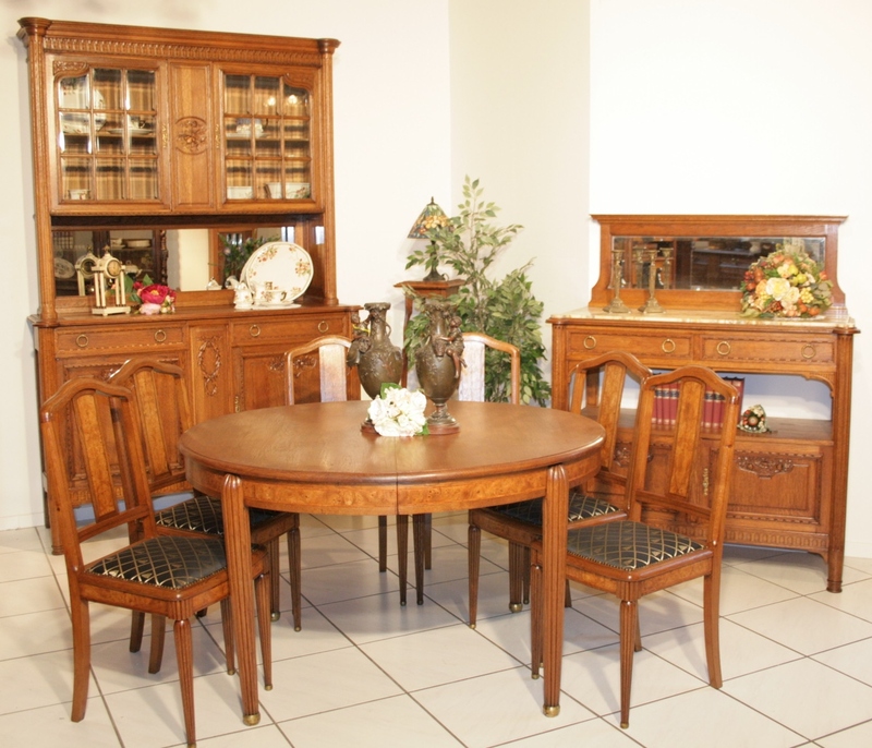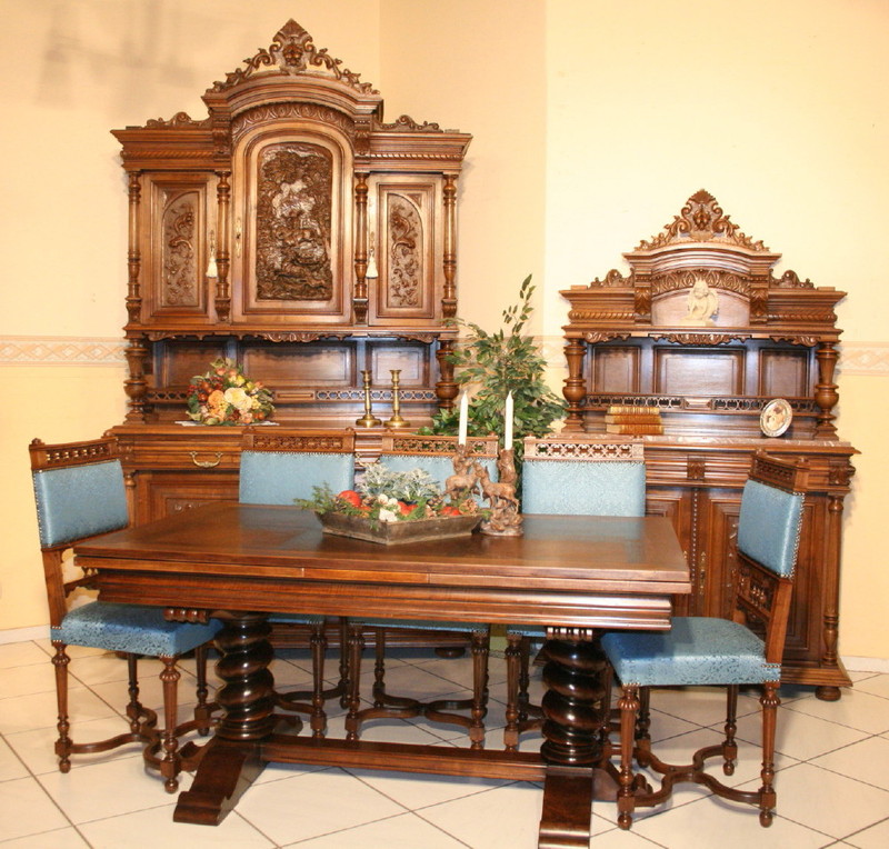 Herrschaftliches Speisezimmer um 1870 Herrschaftliches Speisezimmer um 1870, besteht aus Büffet, schmales Büffet, Speisetisch 4,50 m lang und 6 Hochlehnstühlen komplett neu gepolstert. 0.00 € |