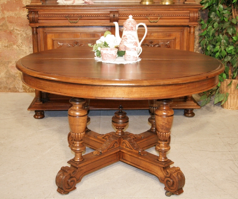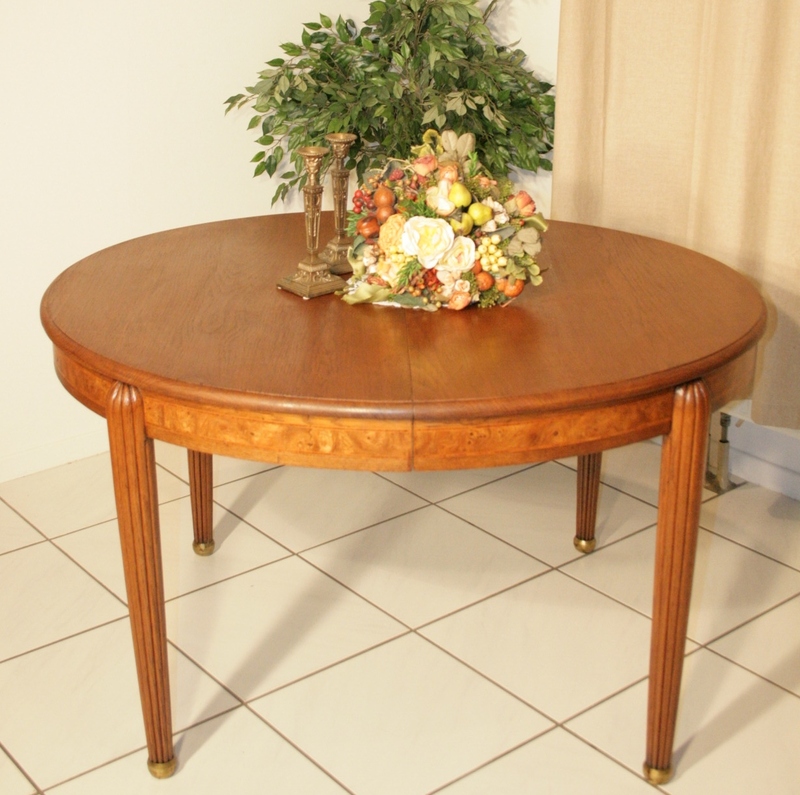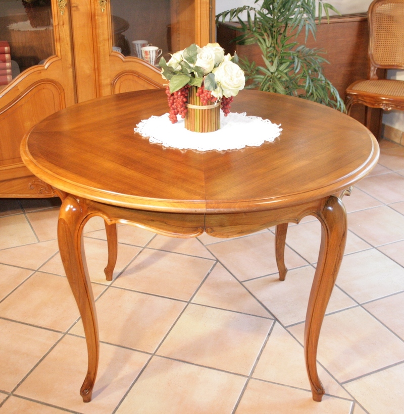 Eleganter Louis XV speisetisch in edlem Nussbaum Eleganter Louis XV Speisetisch in edlem Nussbaum, mit 2 Einlegeplatten. Durchmesser 1,05 m ausgezogen 2,05 m Höhe 75 cm Gerne mailen wir Ihnen Detailfotos zu 0.00 € |