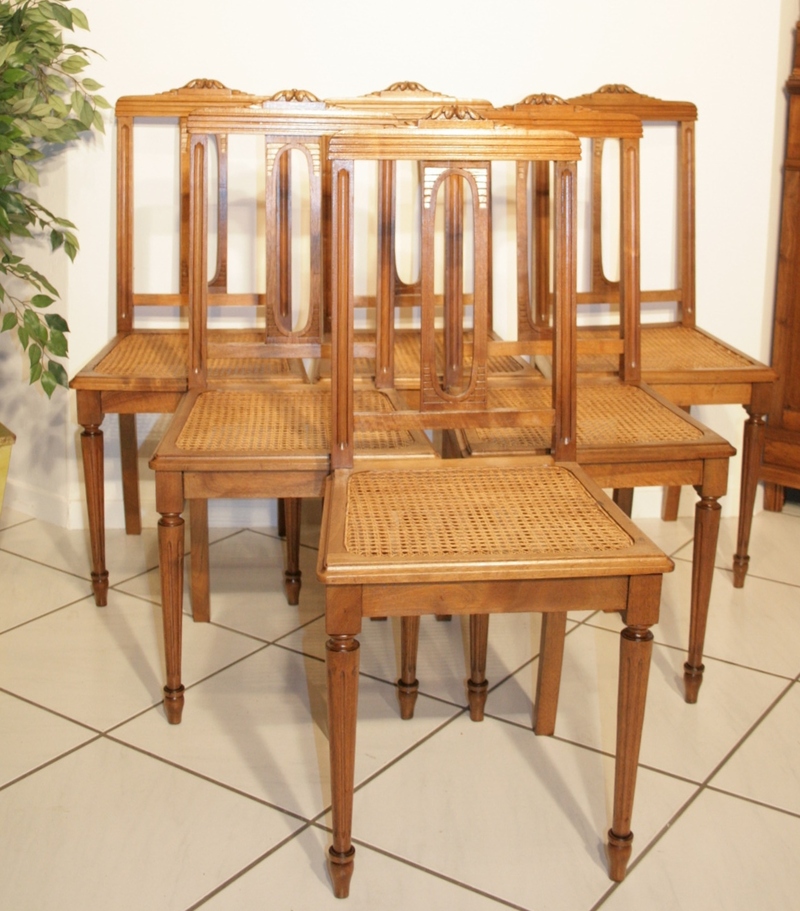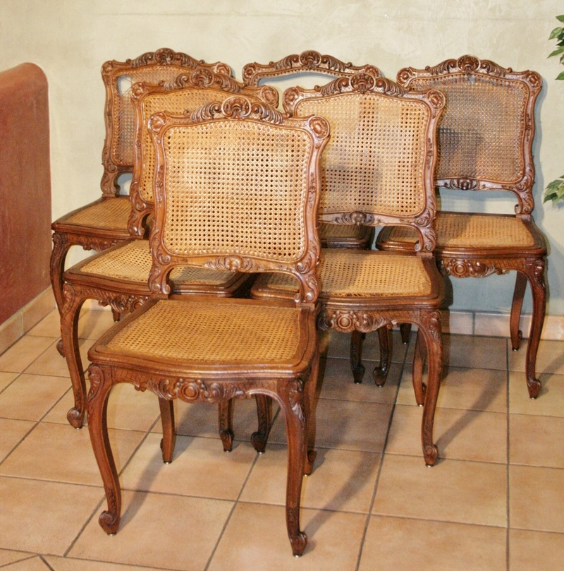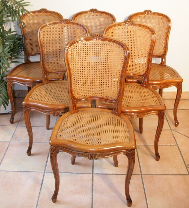 6 Elegante Louis XV Stühle in edlem Nussbaum 6 Elegante Louis XV Stühle in edlem Nussbaum mit original Geflecht Breite 47 cm Tiefe 44 cm Sitzhöhe 45 cm Höhe 93 cm Gerne mailen wir Ihnen Detailfotos zu 0.00 € |