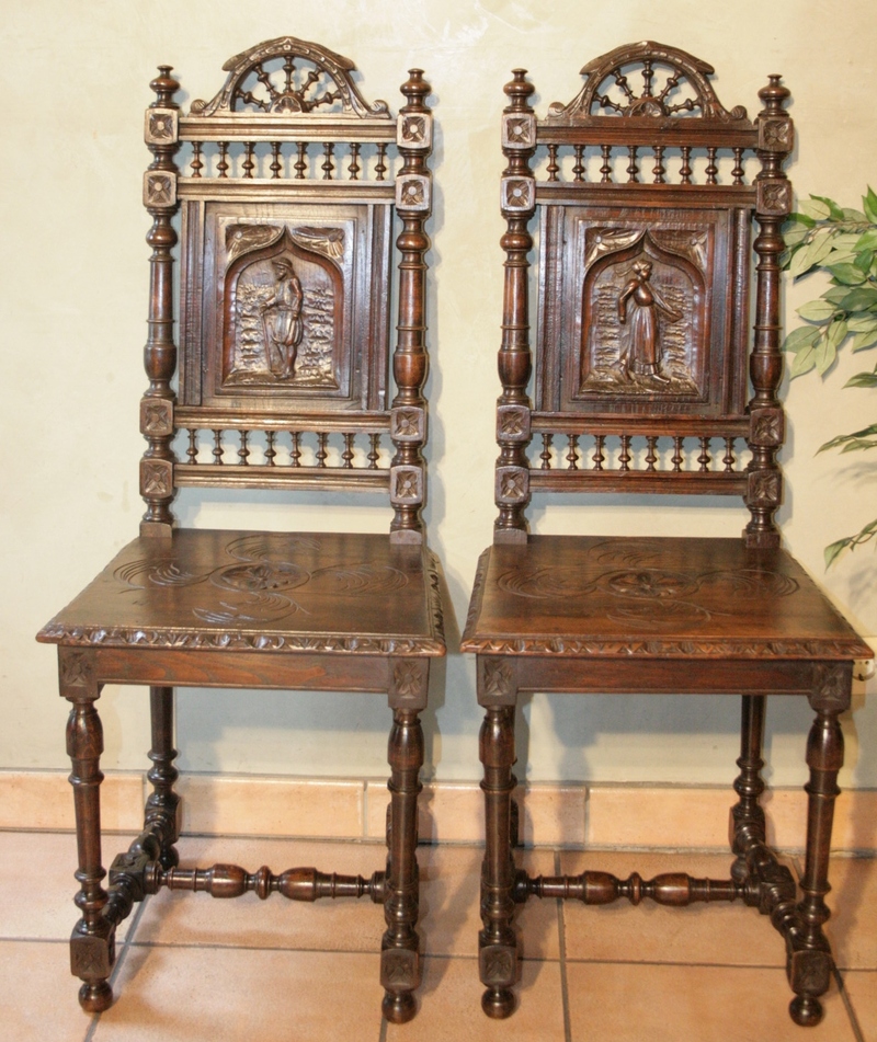 2 Bretonische Stühle "Mann & Frau" in Eiche um 1880 2 Bretonische Stühle "Mann & Frau " in Eiche um 1880 Breite 45 cm Tiefe 40 cm Sitzhöhe 48 cm Höhe 1,10 m Gerne mailen wir Ihnen Detailfotos zu.
