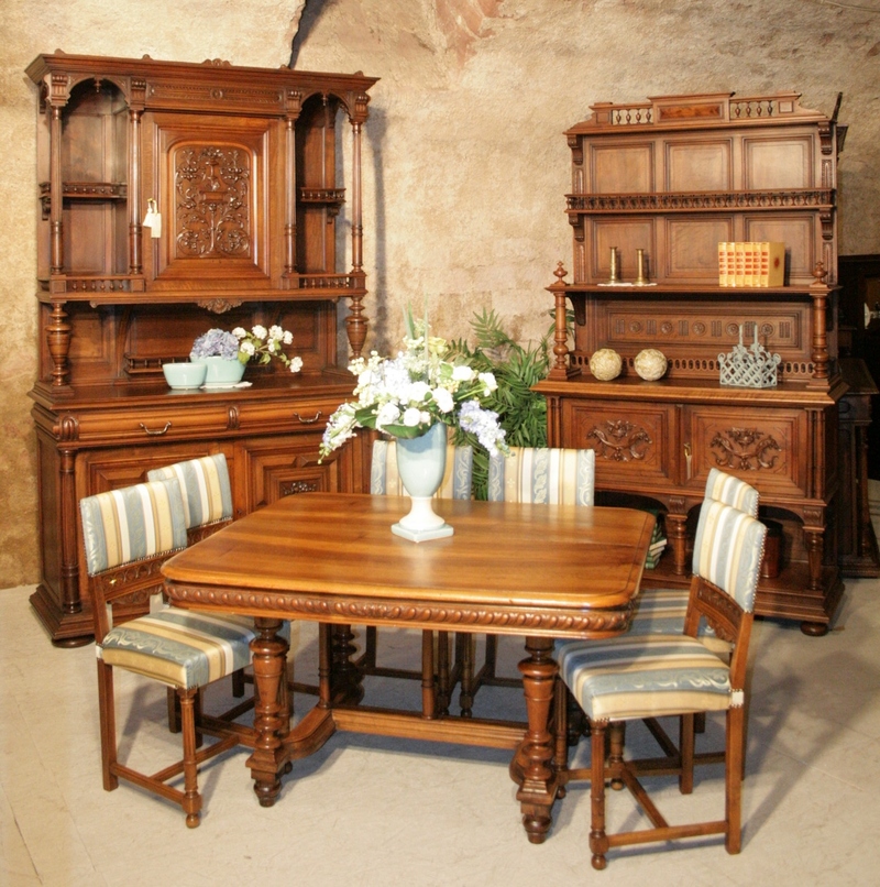 Schönes Speisezimmer in edlem Nussbaum um 1880 Schönes Speisezimmer in edlem Nussbaum um 1880, besteht aus Büffet, Speisetisch mit 3 zusätzlichen Einlegeplatten und 6 Stühlen mit Prägeleder. Gerne mailen wir Ihnen Detailbilder zu. 0.00 € |
