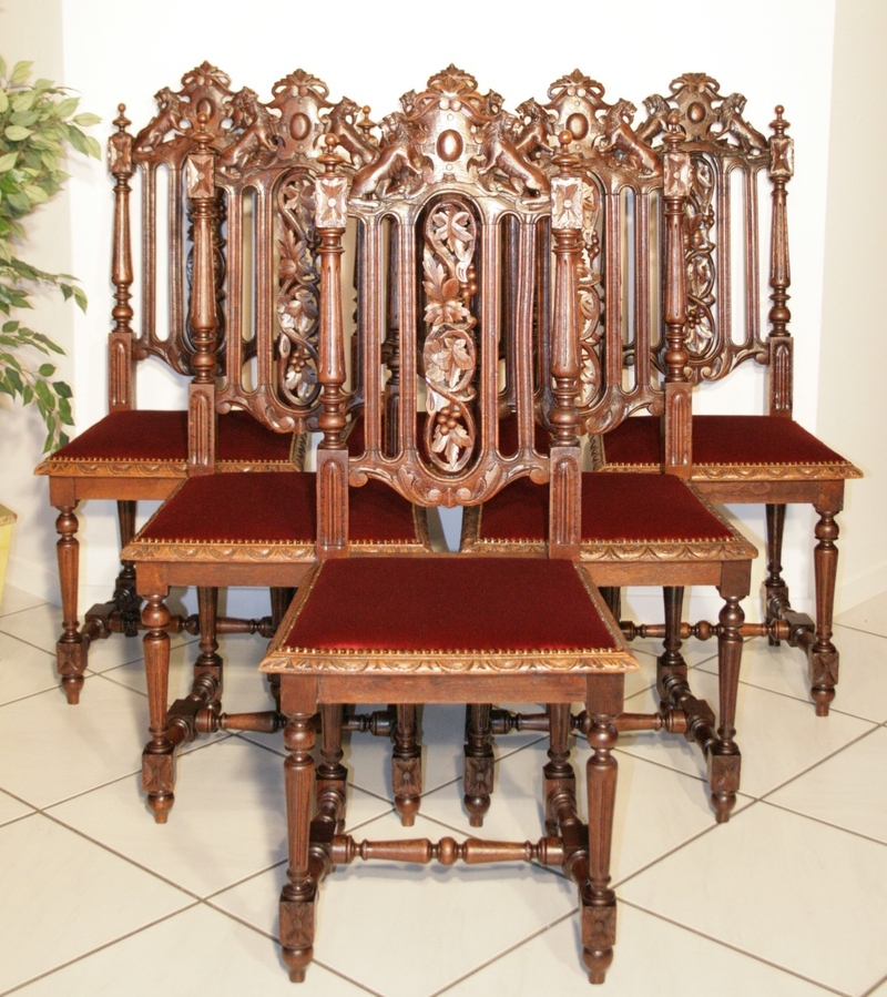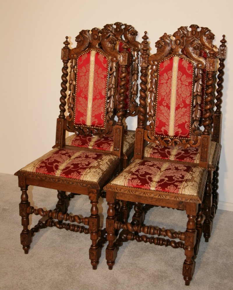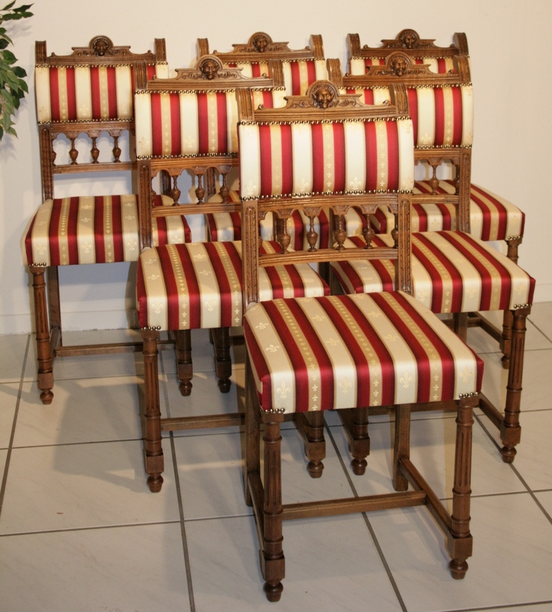 6 Hochlehnstühle - Jagdstühle mit Löwen um 1870 6 Hochlehnstühle - Jagdstühle mit Löwen um 1870, in Eiche, komplett neu gepolstert. Breite 47 cm Tiefe 42 cm Höhe 1,15 m Sitzhöhe 49 cm Gerne mailen wir Ihnen Detailfotos zu. 0.00 € |