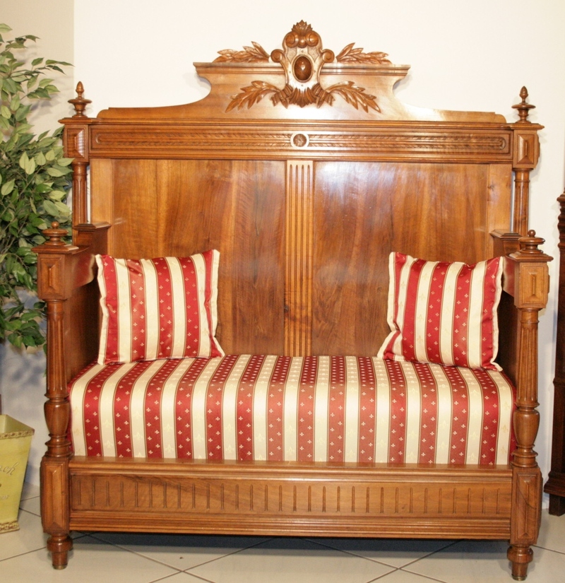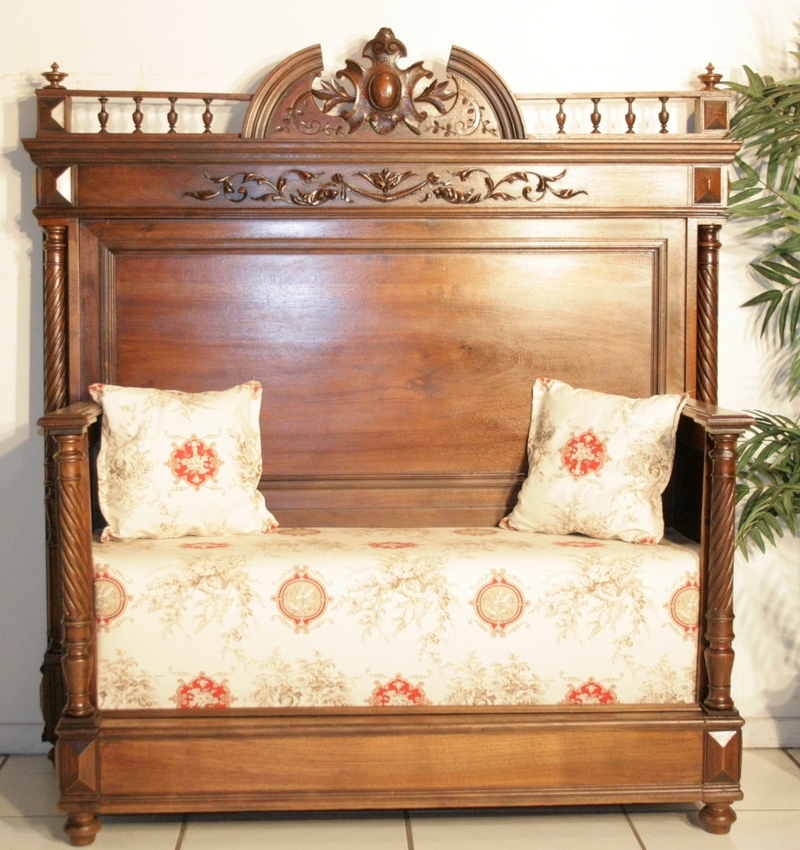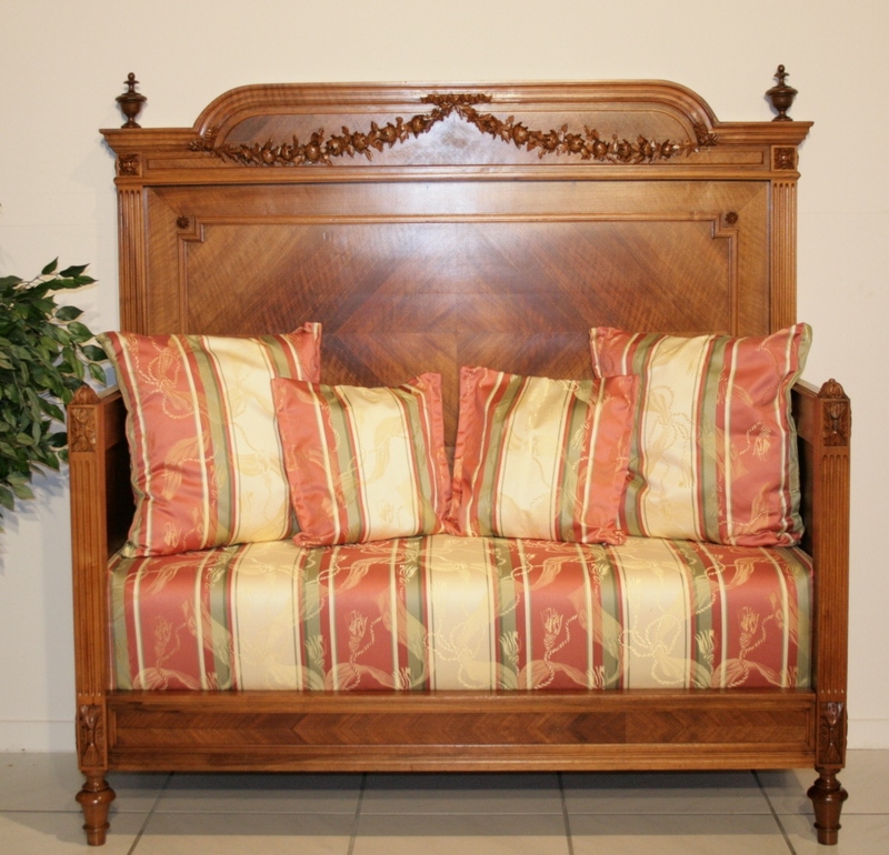 Elegantes kleines Sofa Sitzbank um 1890 in Nussbaum Elegante Sitzbank un 1890 in Nussbaum, mit vier Kissen, komplett neu gepolstert Breite 1,47 m Tiefe 56 cm Höhe 1,47 m Sitzhöhe 50 cm 0.00 € |