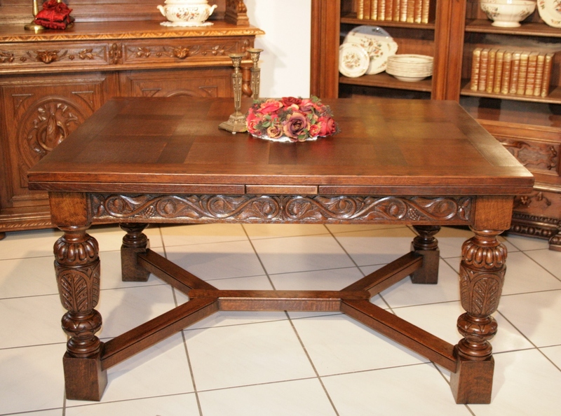 Herrschaftlicher Speisetisch mit Parketteinlage in Eiche Herrschaftlicher Speisetisch mit Parketteinlage in Eiche, reich geschnitzt Breite 1,20 m Höhe 77 cm Länge 1,40 m ausgezogen 2,60 m 0.00 € |