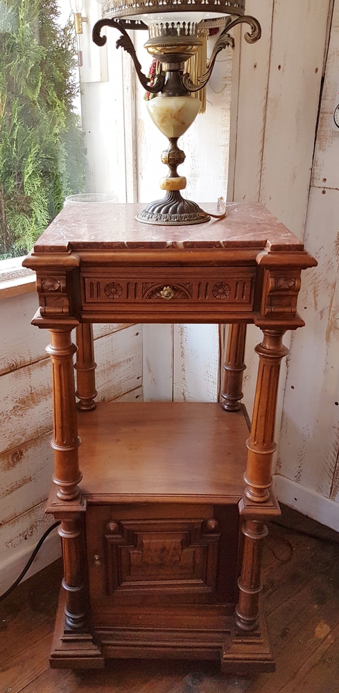 Elegantes Beistellmöbel um 1880 in Nussbaum Elegantes Beistellmöbel um 1880 in Nussbaum. Breite 48 cm Tiefe 44 cm Höhe 1,26 m Gerne mailen wir Ihnen Detailbilder zu 0.00 € |
