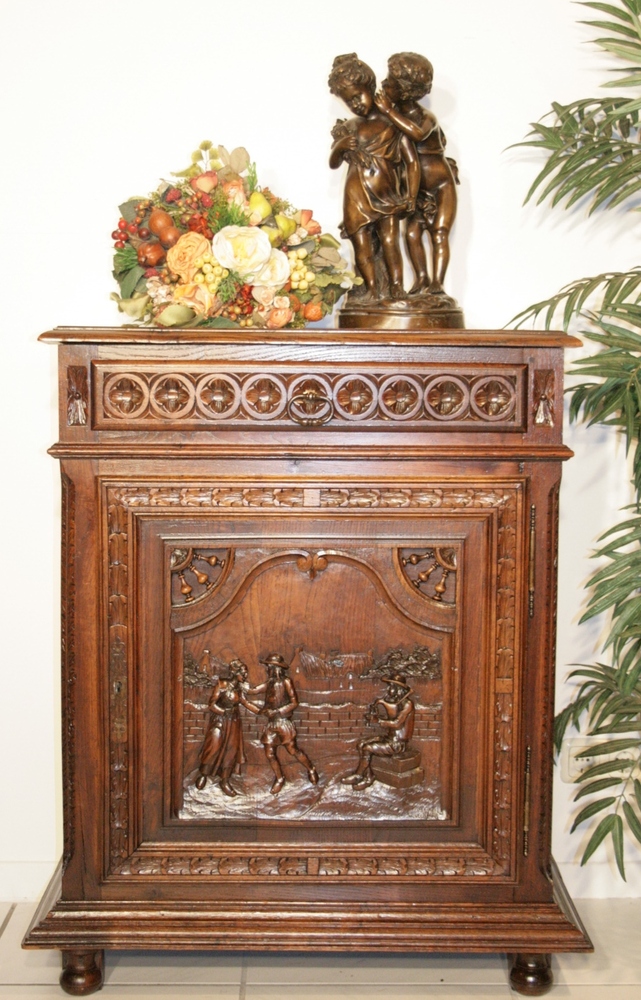 Prachtvolle Anrichte reich geschnitzt in Eiche um 1880 Prachtvolle Anrichte reich geschnitzt aus Eiche um 1880 Breite 1,36 m Tiefe 60 cm Höhe 95 cm 0.00 € |