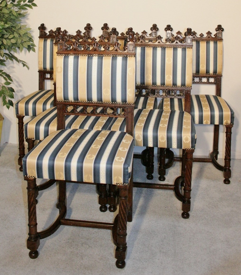 6 Herrschaftliche Hochlehnstühle in Eiche um 1870 6 Herrschaftliche Hochlehnstühle in Eiche um 1870, komplett neu gepolstert Breite 46 cm Tiefe 43 cm Höhe 1,13 m Sitzhöhe 51 cm 0.00 € |
