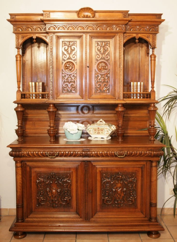 Elegante Kredenz Büffet in Nussbaum um 1880 Elegante Kredenz Büffet in Nussbaum um 1880, reich geschnitzt. Breite 1,50 m Tiefe 57 cm Höhe 2,47 m 1300.00 € |