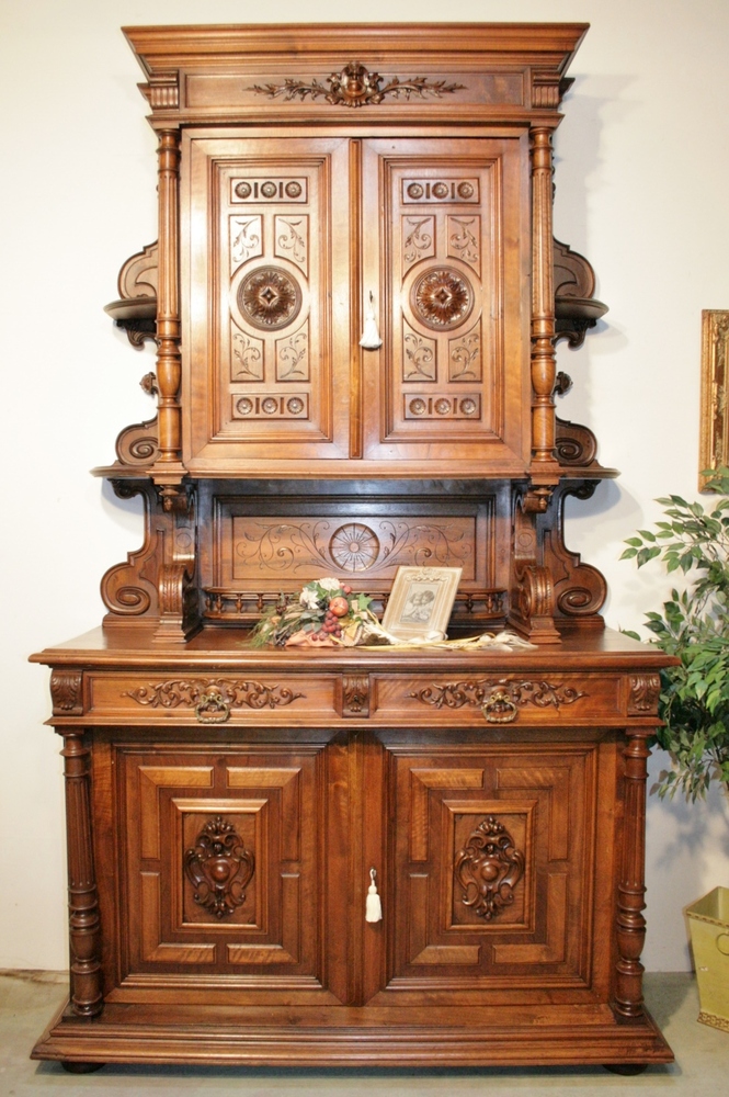 Schlossmöbel Kredenz Büffet in Nussbaum um 1880 Schlossmöbel Kredenz Büffet in Nussbaum um 1880, reich geschnitzt Breite 1,65 m Tiefe 60 cm Höhe 2,73 m 1800.00 € |