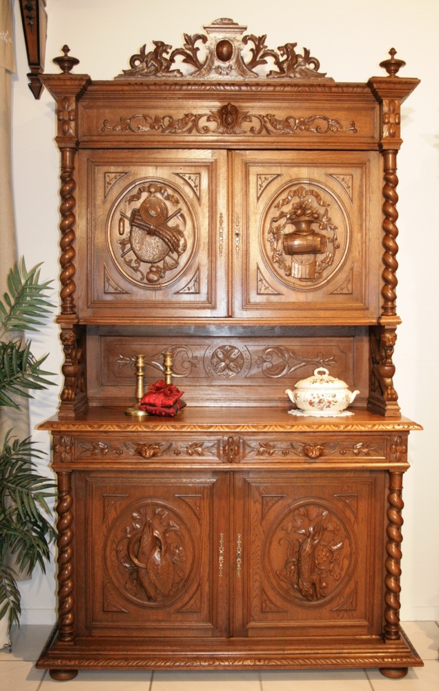 Herrschaftliche Kredenz Büffet in Eiche um 1870 Herrschaftliche Kredenz Büffet in Eiche um 1870, reich geschnitzt Breite 1,40 m Tiefe 55 cm Höhe 2,26 m + 24 cm Krone Gesamthöhe 2,50 m 1200.00 € |