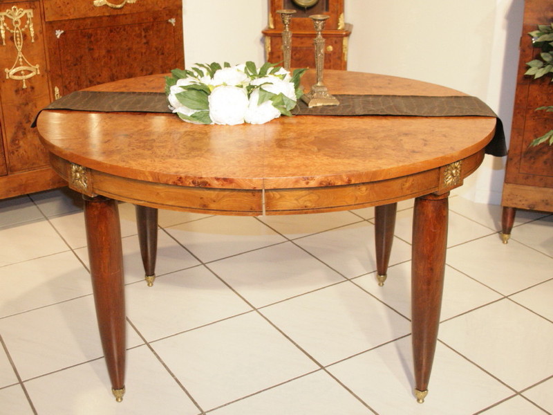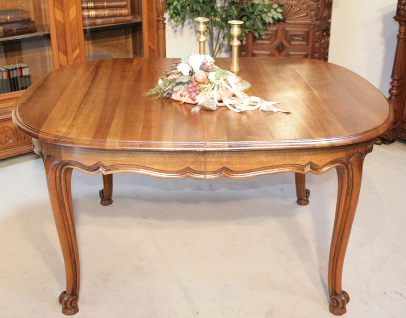 Eleganter Louis XV speisetisch in edlem Nussbaum Eleganter Louis XV Speisetisch in edlem Nussbaum, mit 2 Einlegeplatten. Durchmesser 1,05 m ausgezogen 2,05 m Höhe 75 cm Gerne mailen wir Ihnen Detailfotos zu 0.00 € |