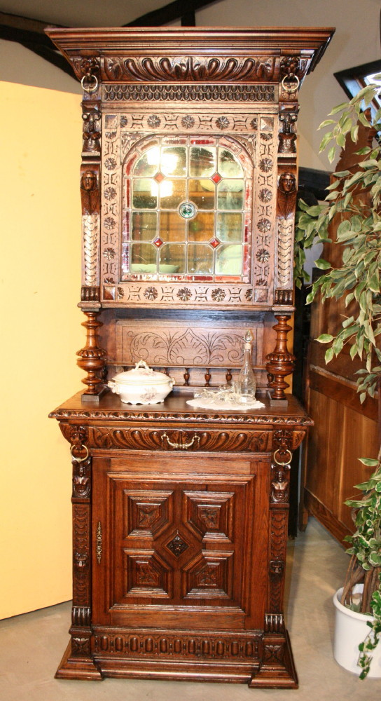 Wunderschöne schmalle Kredenz Büffet in Eiche um 1870 Wunderschöne schmalle Kredenz Büffet in Eiche um 1870 mit buntem Glas. Breite 91 cm (Mitte) Tiefe 51 cm Höhe 2,32 m Gerne mailen wir Ihnen Detailbilder zu. 0.00 € |