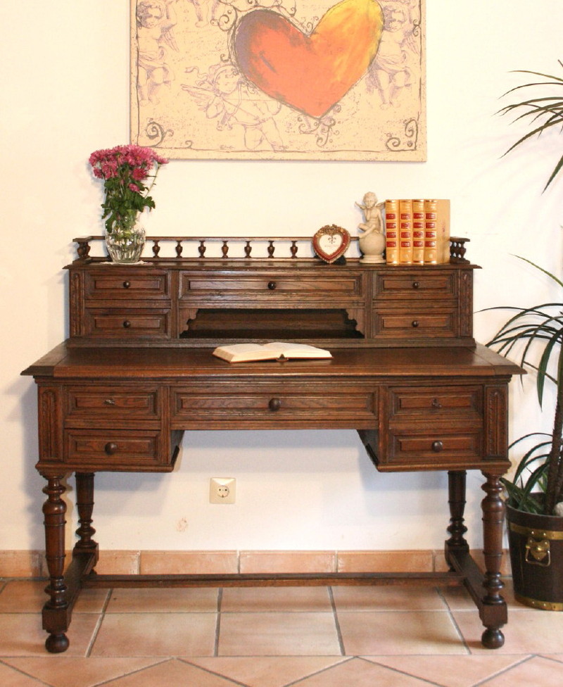 Herrschaftlicher Schreibtisch in Eiche um 1870 Herrschaftlicher Schreibtisch in Eiche um 1870 Breite 1,27 m Tiefe 67 cm Höhe 78 cm 0.00 € |