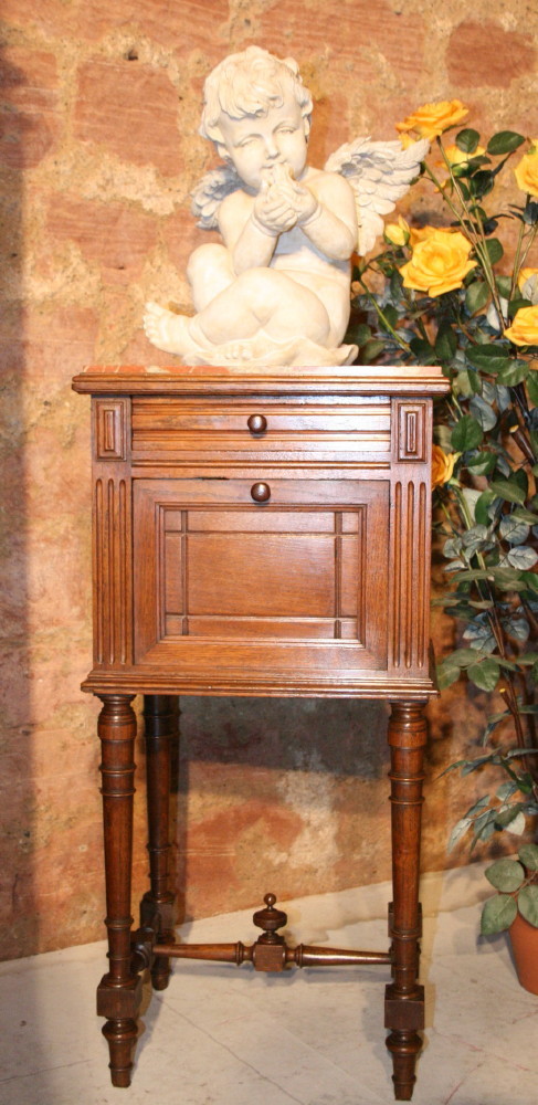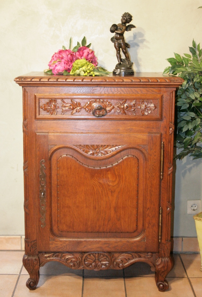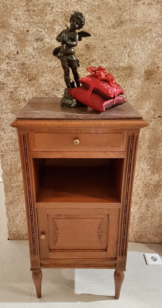 Wunderschönes Bretonisches Beistellmöbel in Eiche Wunderschönes Bretonisches Beistellmöbel, Teil eines Schlafzimmer in Eiche um 1880, besteht aus einem 3-Türiger Kleiderschrank, einem Bett und 2 Beistellmöbel sowie ein Stuhl. Breite 40 cm Tiefe 35 cm Höhe 88 cm