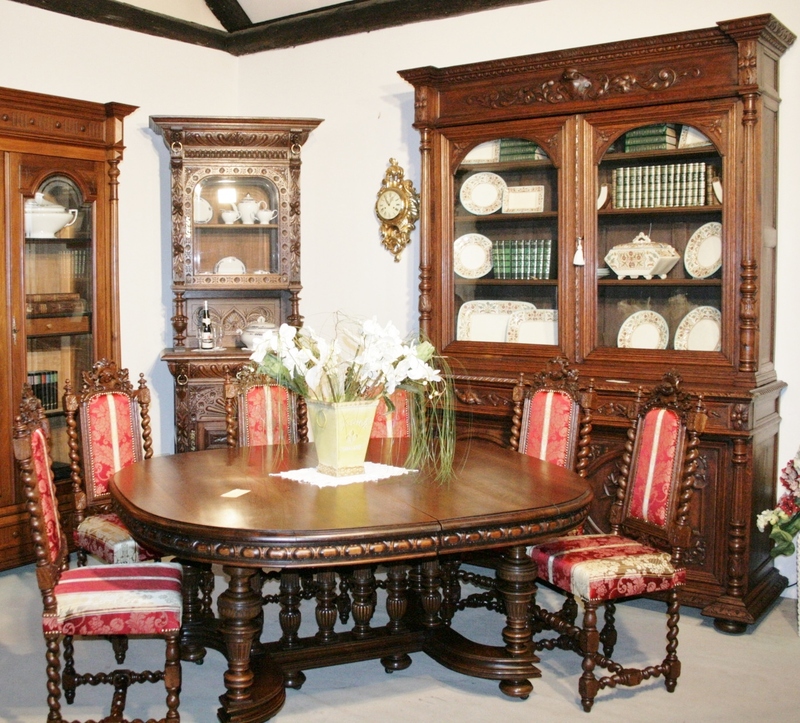 Herrschaftliches Speisezimmer um 1870 Herrschaftliches Speisezimmer um 1870, besteht aus Büffet, schmales Büffet, Speisetisch 4,50 m lang und 6 Hochlehnstühlen komplett neu gepolstert. 0.00 € |