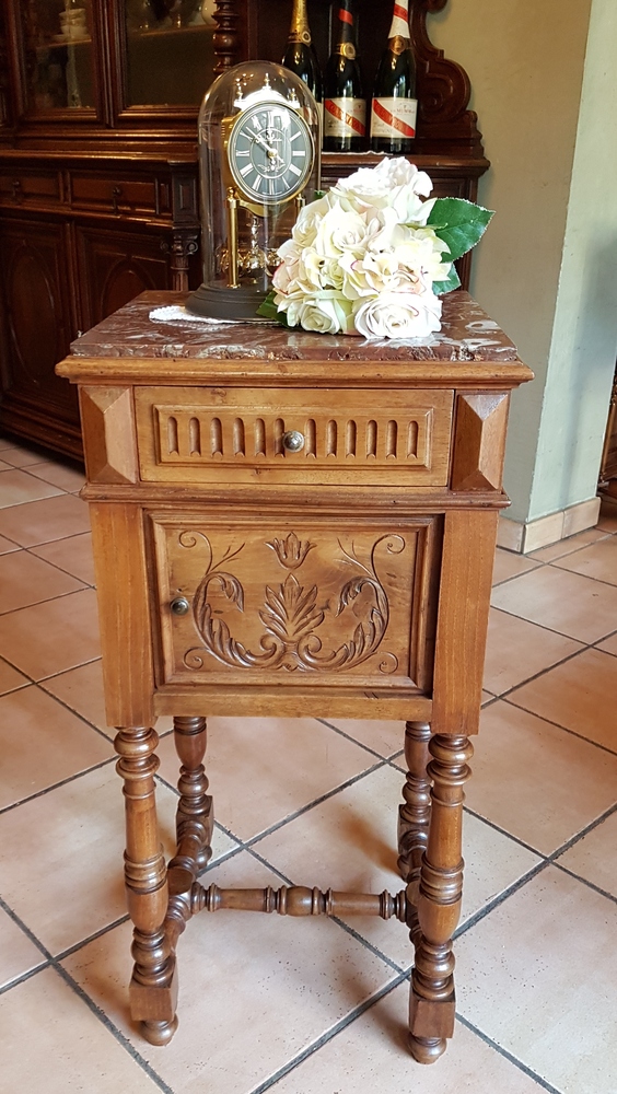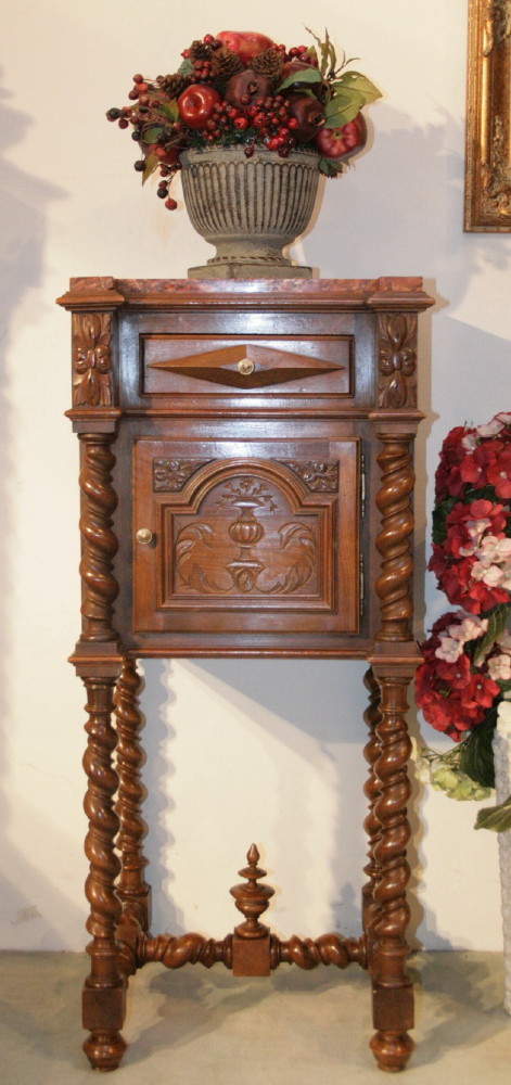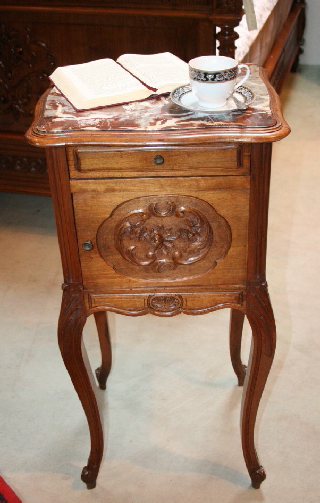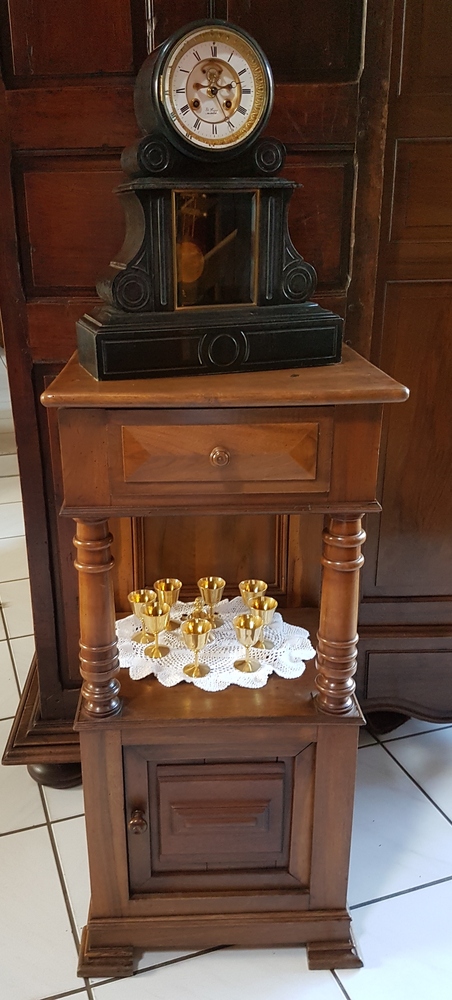 Elegantes Beistellmöbel in massiven Nussbaum um 1870 Elegantes Beistellmöbel, Teil eines Schlafzimmer um 1870 in massiven Nussbaum, reich geschnitzt, mit gedrehte Säulen, Top Zustand. Das Schlafzimmer besteht aus einem Kleiderschrank, eine Kommode, einem Bett und 1 Beistellmöbel. Breite 44 cm Tiefe 40 cm Höhe 98 cm 0.00 € |