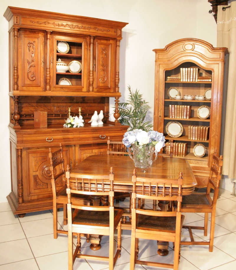 Elegante Louis XV Speisezimmer in edlem Nussbaum Elegante Louis XV Speisezimmer in edlem Nussbaum, besteht aus Büffet - Bücherschrank, Speisetisch mit 2 zusätzlichen Einlegeplatten und 6 Stühlen.