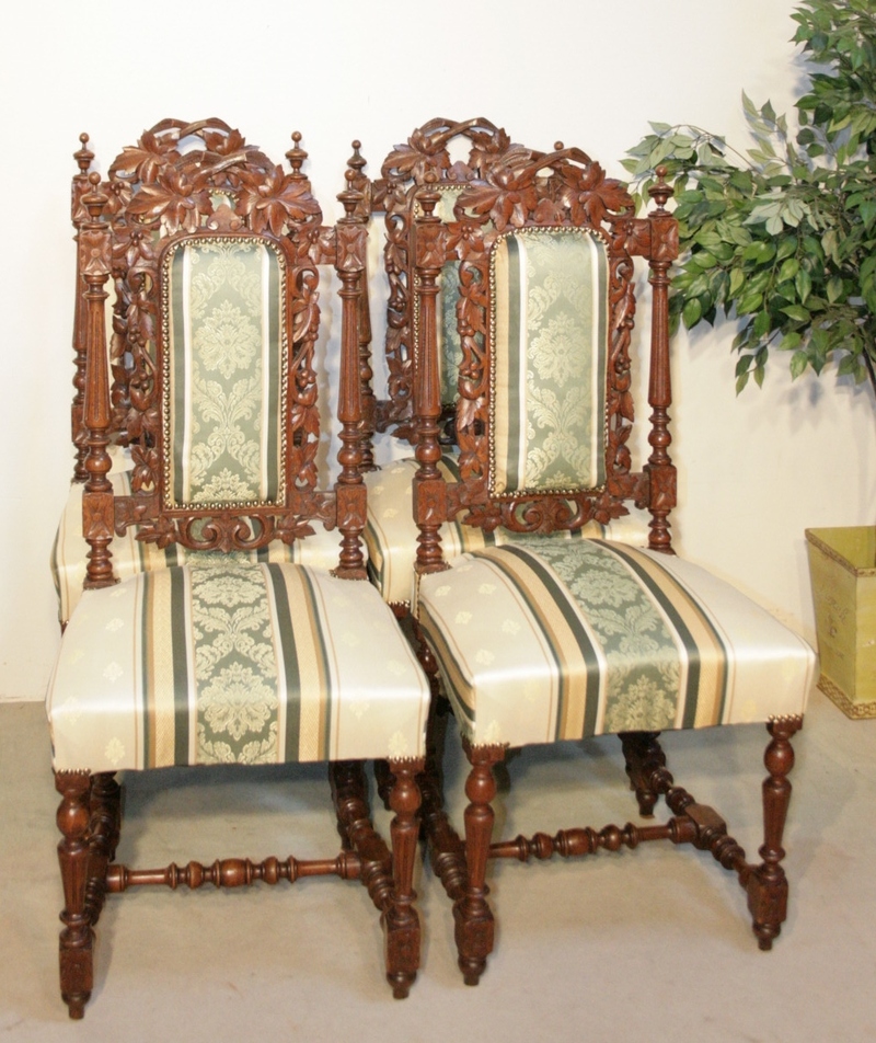 6 Herrschaftliche Hochlehnstühle in Eiche um 1870 6 Herrschaftliche Hochlehnstühle in Eiche um 1870, komplett neu gepolstert Breite 46 cm Tiefe 43 cm Höhe 1,13 m Sitzhöhe 51 cm 0.00 € |