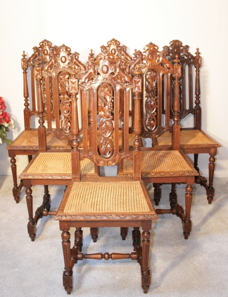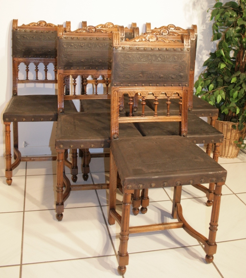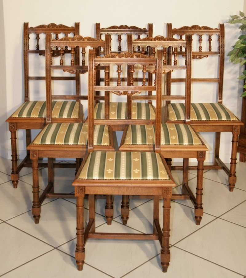 6 Wunderschöne Stühle in Eiche um 1880 6 Wunderschöne Stühle in Eiche um 1880. Breite 43 cm Tiefe 40 cm Höhe 93 cm Sitzhöhe 47 cm Gerne mailen wir Ihnen Detailbilder zu 0.00 € |