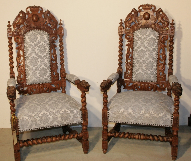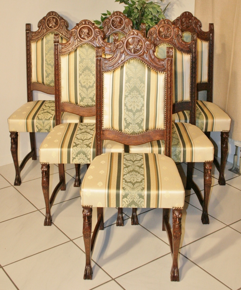 6 Hochlehnstühle - Jagdstühle mit Löwen um 1870 6 Hochlehnstühle - Jagdstühle mit Löwen um 1870, in Eiche, komplett neu gepolstert. Breite 47 cm Tiefe 42 cm Höhe 1,15 m Sitzhöhe 49 cm Gerne mailen wir Ihnen Detailfotos zu. 0.00 € |