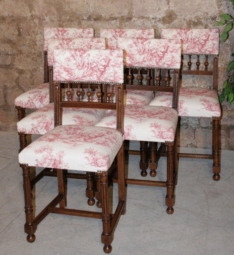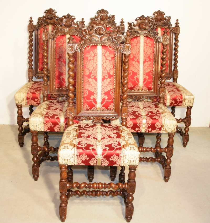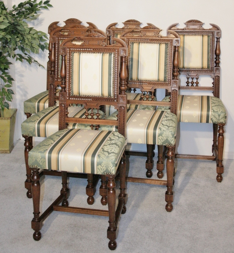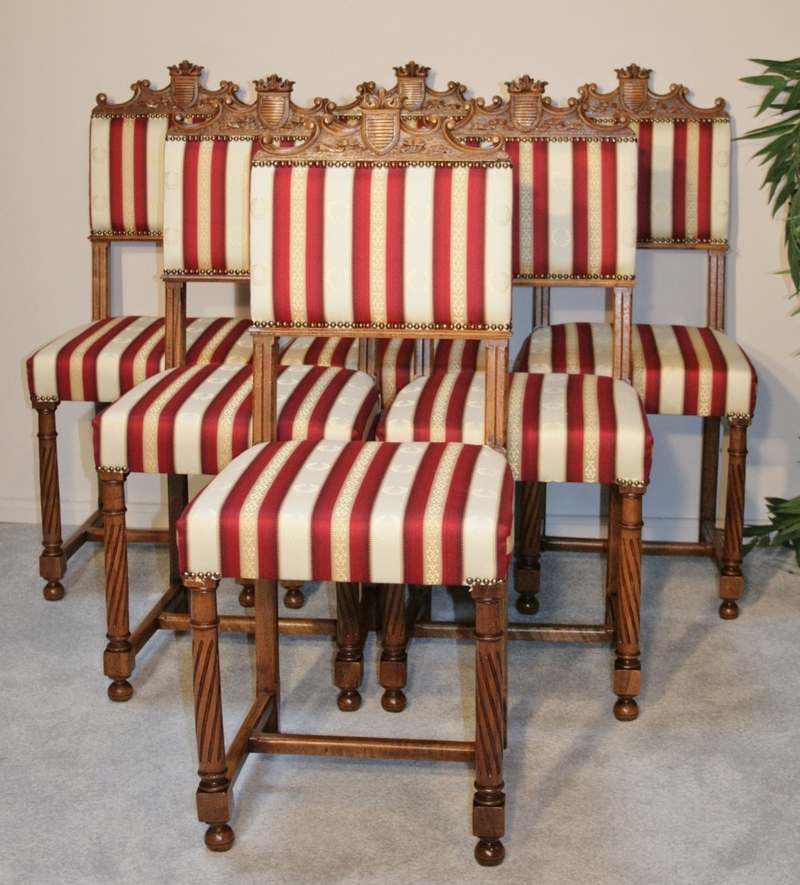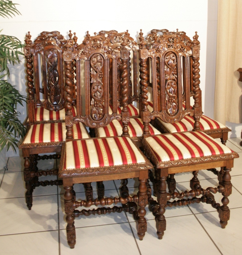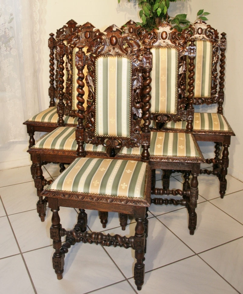 6 Wunderschöne Stühle mit Säulchen & Krone auf die Lehne 6 Wunderschöne Stühle in Nussbaum um 1880, komplett neu gepolstert Breite 46 cm Tiefe 41 cm Sitzhöhe 47 cm Höhe 95 cm 0.00 € |