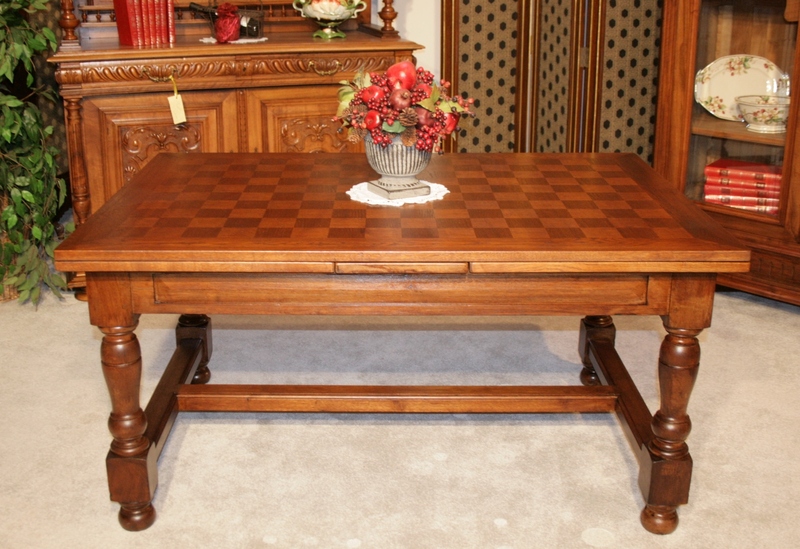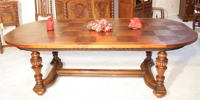 Herrschaftlicher Speisetisch mit Parketteinlage in Eiche Herrschaftlicher Speisetisch mit Parketteinlage in Eiche, reich geschnitzt Breite 1,20 m Höhe 77 cm Länge 1,40 m ausgezogen 2,60 m 0.00 € |