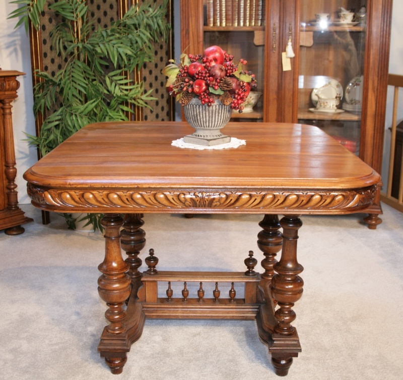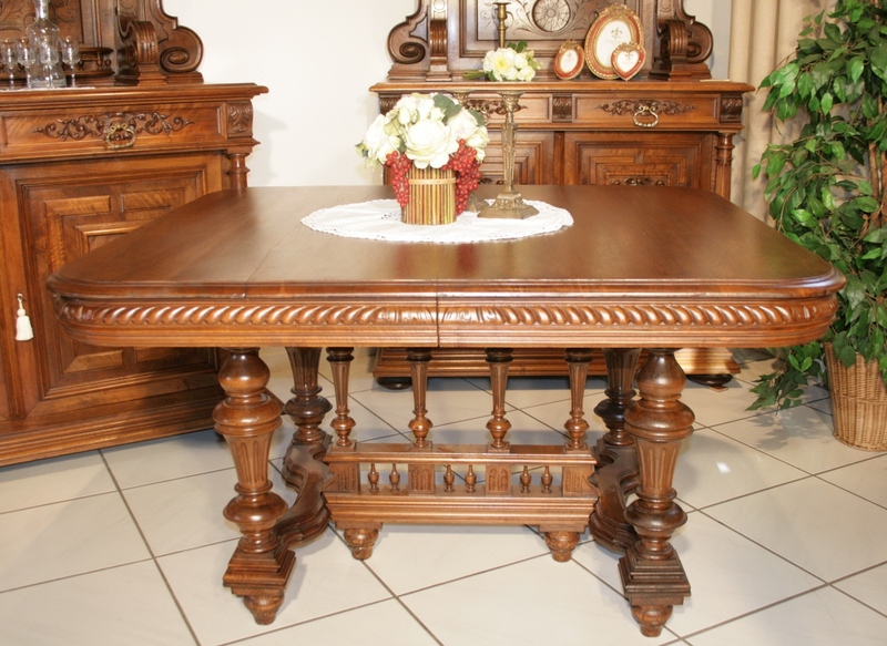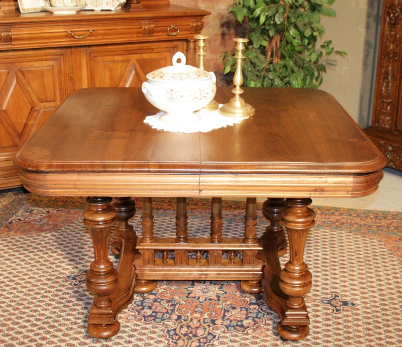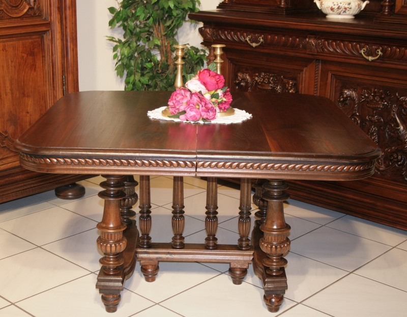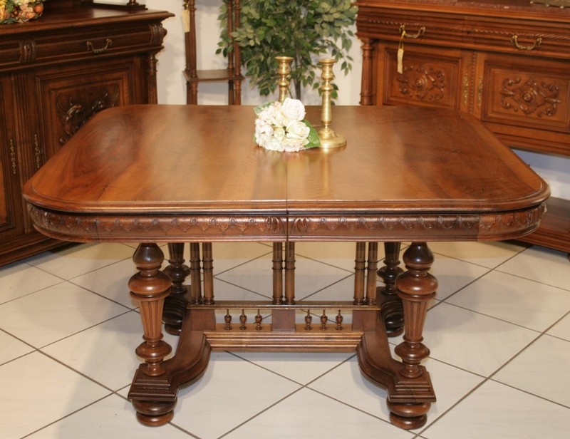 Wunderschöner Speisetisch für 12 Personen in Eiche Wunderschöner Speisetisch für 12 Personen in Eiche um 1880, mit 3 zusätzlichen Einlegeplatten. Breite 1,05 m Länge 1,14 m ausgezogen 2,17 m 0.00 € |