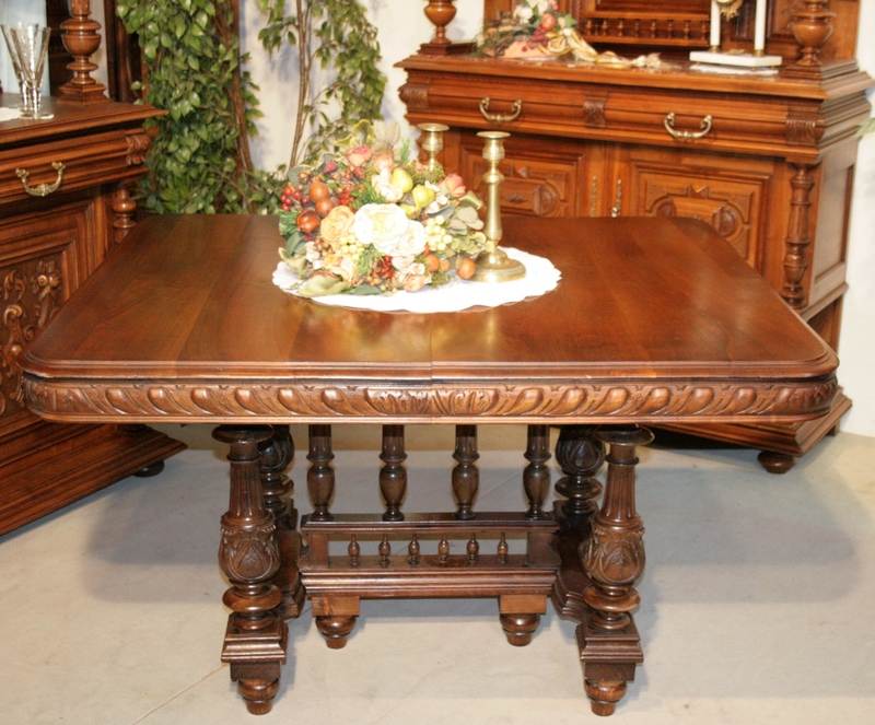 Schönes Speisezimmer in edlem Nussbaum um 1880 Schönes Speisezimmer in edlem Nussbaum um 1880, besteht aus Büffet, Speisetisch mit 3 zusätzlichen Einlegeplatten und 6 Stühlen mit Prägeleder. Gerne mailen wir Ihnen Detailbilder zu. 0.00 € |