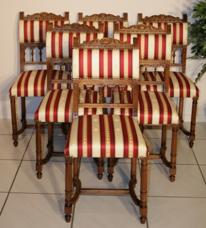 6 Wunderschöne Stühle in Nussbaum um 1880 6 Wunderschöne Stühle in Nussbaum um 1880, komplett neu gepolstert. Breite 44cm Tiefe 42 cm Höhe 1,00 m Sitzhöhe 49 cm 0.00 € |