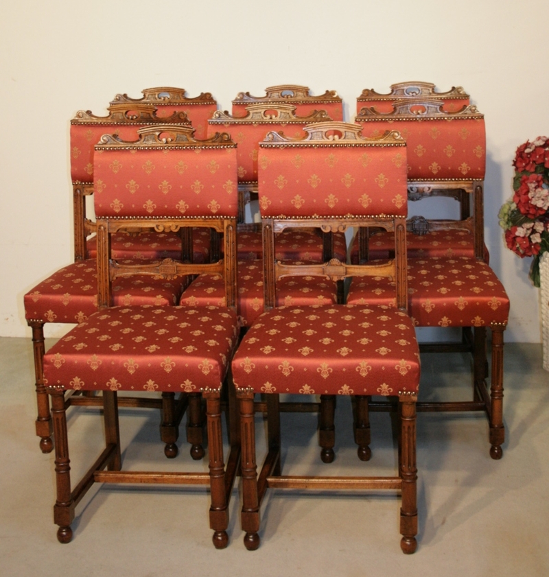 6 Elegante Stühle in Nussbaum um 1880 6 Elegante Stühle in Nussbaum um 1880, komplett neu gepolstert. Breite 43 cm Tiefe 41 cm Höhe 98 cm Sitzhöhe 49 cm 0.00 € |