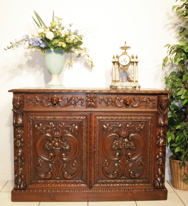 Prachtvolle Anrichte reich geschnitzt in Eiche um 1880 Prachtvolle Anrichte reich geschnitzt aus Eiche um 1880 Breite 1,36 m Tiefe 60 cm Höhe 95 cm 0.00 € |
